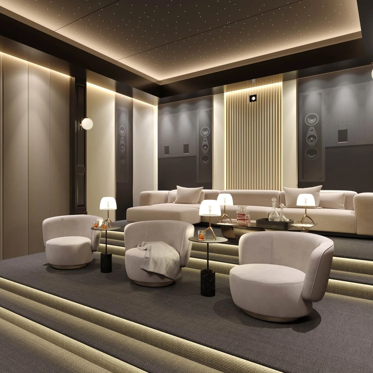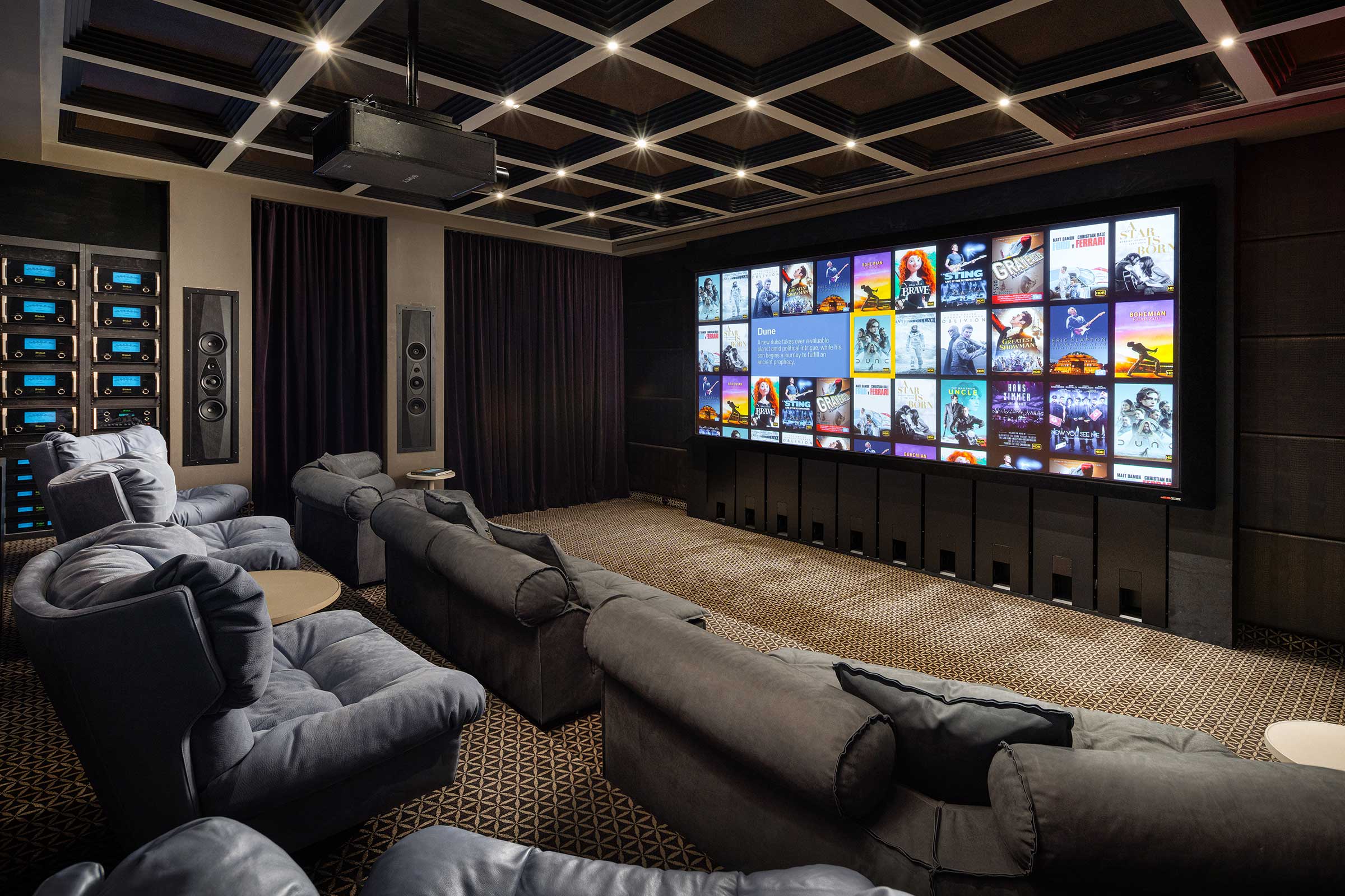 Ein Heimkino bringt Filme und Konzerte intensiv ins eigene Zuhause. Harmonisch gestaltet, mit vielen Lautsprechern, kräftigen Subwoofern und perfektem Bild entsteht ein immersives Erlebnis – komfortabel für Familie und Freunde.