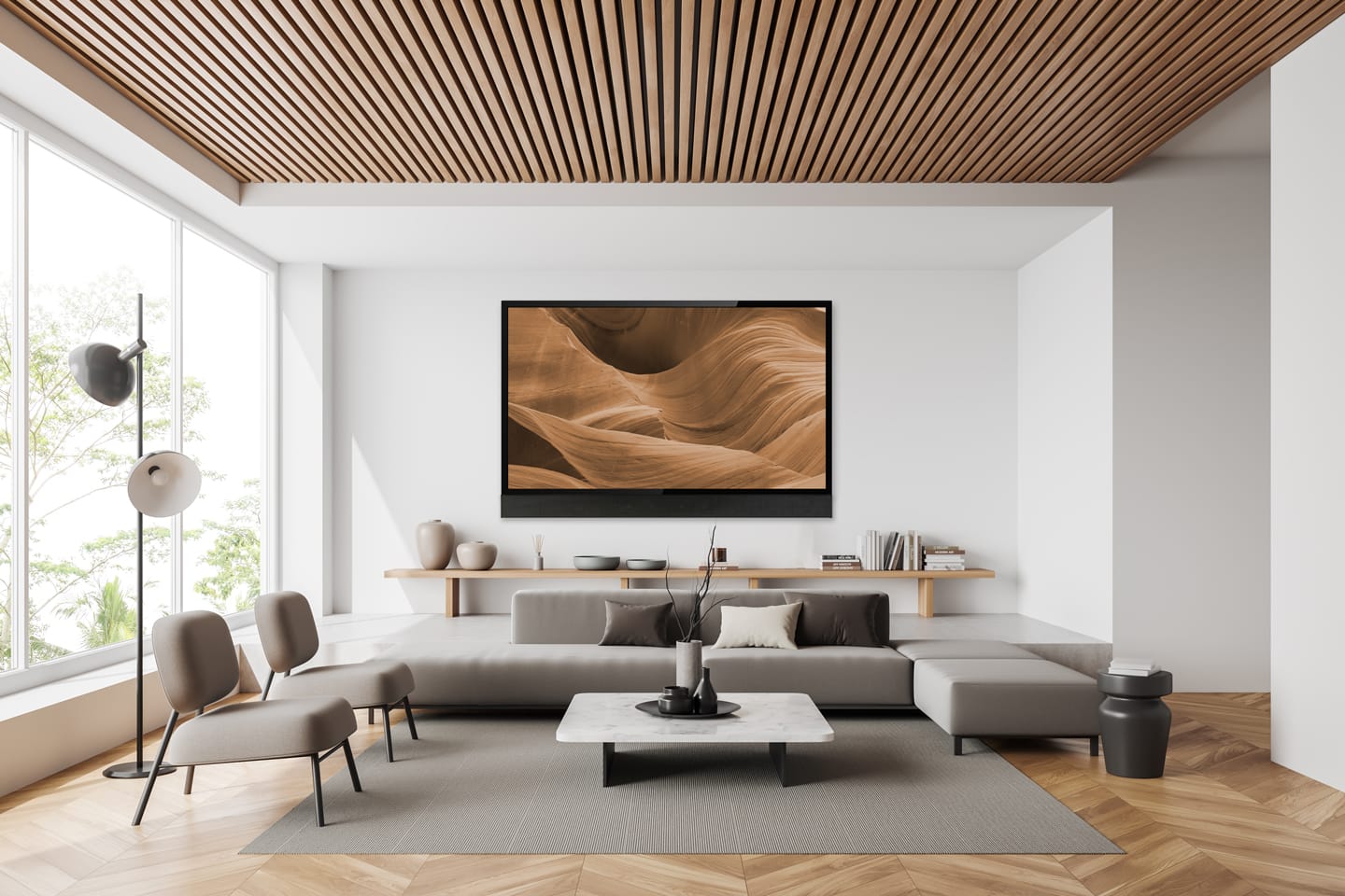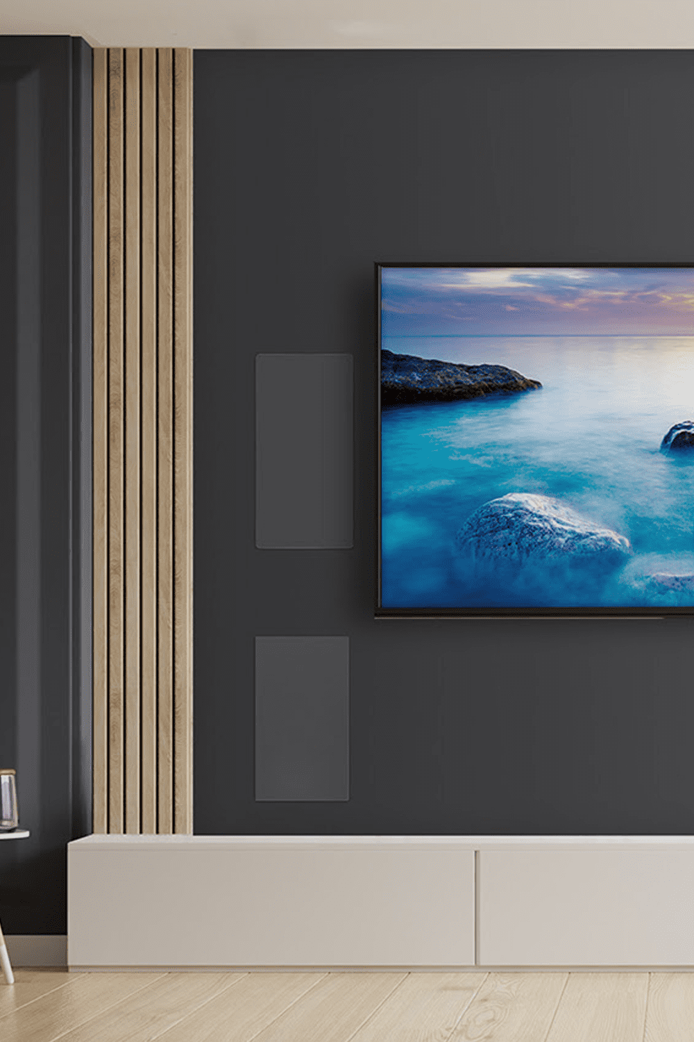 Ein Wohnraumkino verbindet Kinoerlebnis und Alltag. Unauffällige oder unsichtbare Lautsprecher fügen sich ins Ambiente ein, während TV-Lösungen elegant verborgen werden. So entsteht Kinoatmosphäre im Wohnbereich.