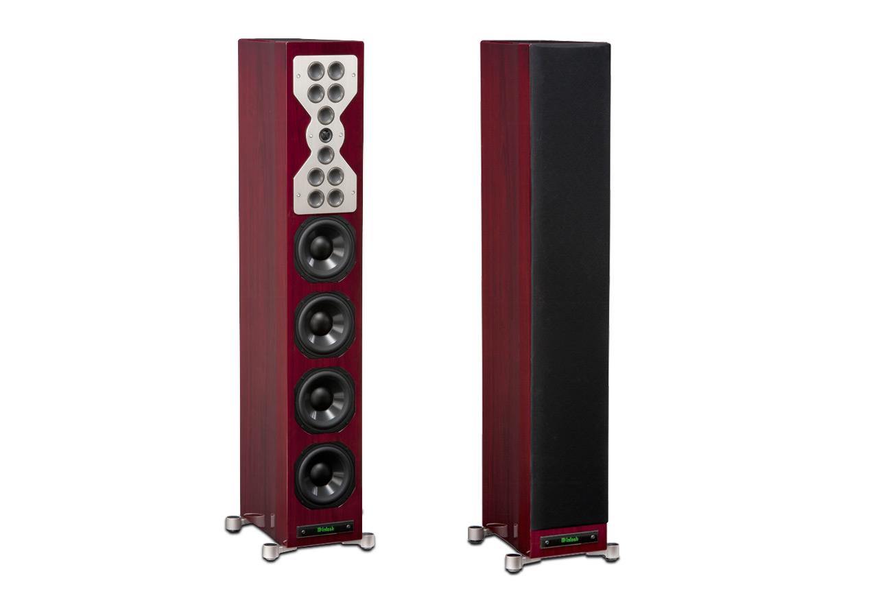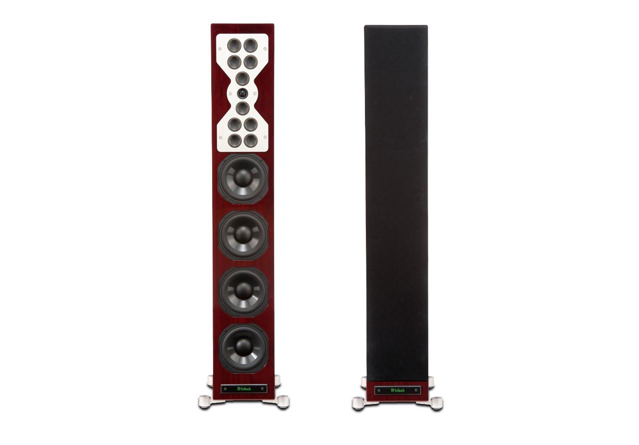 Die magnetisch befestigte Frontabdeckung ist akustisch transparent und mit einem dezenten schwarzen Stoff bezogen. Das McIntosh Logo auf der Frontplatte kann in Verbindung mit einer McIntosh-Anlage beleuchtet werden und unterstreicht so die Zugehörigkeit zur Weltmarke für High-End-Audio.