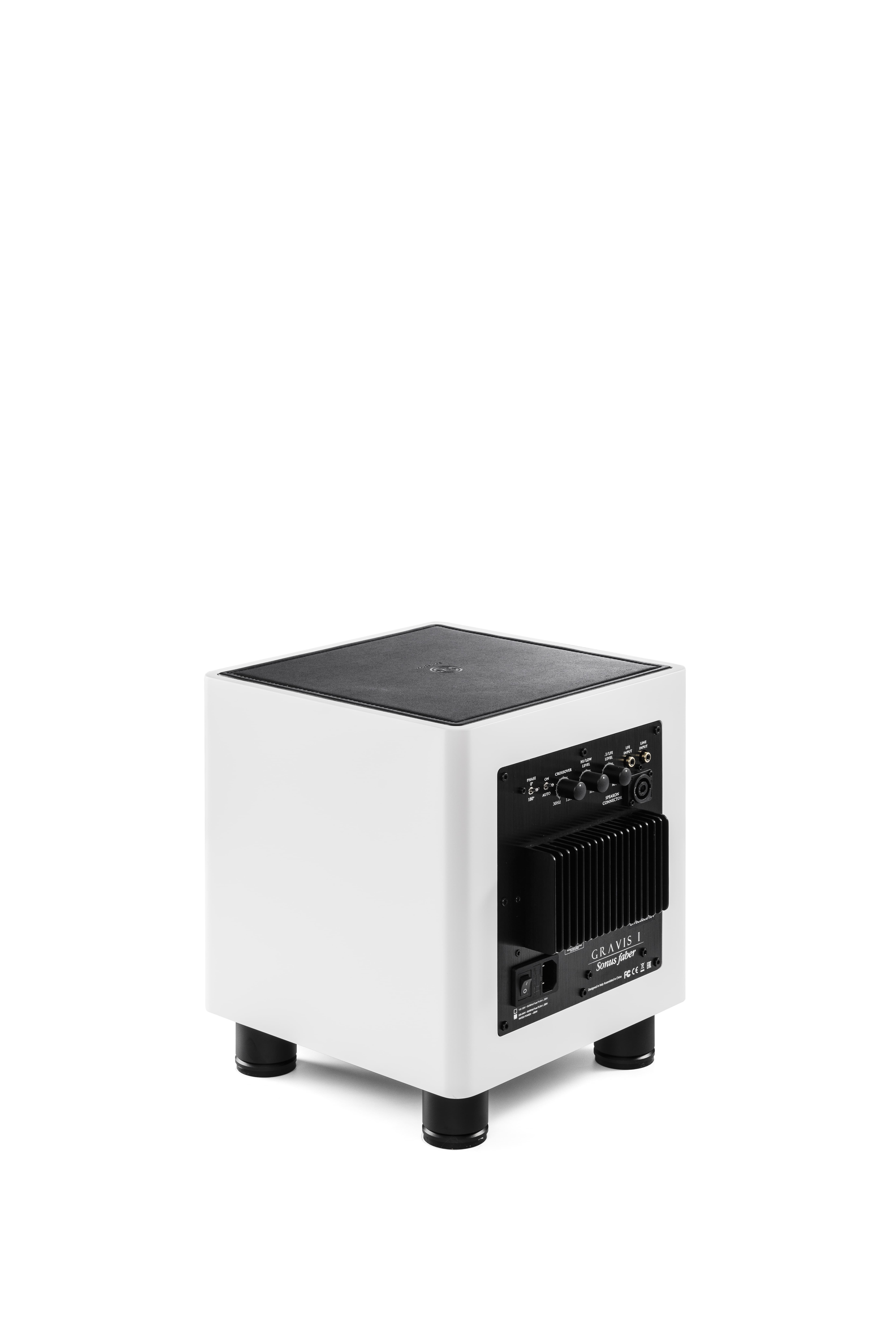 Sein elegantes, quadratisches Gehäuse ist in vier hochwertigen Ausführungen erhältlich. Die Oberseite ziert ein schwarzes Lederpanel, dezent geprägt mit dem Sonus faber Logo – ein charakteristisches Detail italienischer Handwerkskunst.